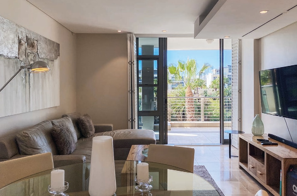 AIRBNB FEES INCL. SUNNY BALCONY I SIGNAL HILL VIEWS I 3 MINS TO WATERFRONT I 24HR SECURITY I ROOFTOP VIEWS I POOL I UNINTERRUPTED POWER A modern apartment situated at pooular Docklands, within walking distance of the V&A Waterfront. It features a large terrace which is bathed in sunshine and lends to a great indoor/outdoor living space, perfect for sunbathing or dining Al fresco. Featuring modern appliances, Fibre Internet and Netflix. Affordable luxury for a comfortable stay.