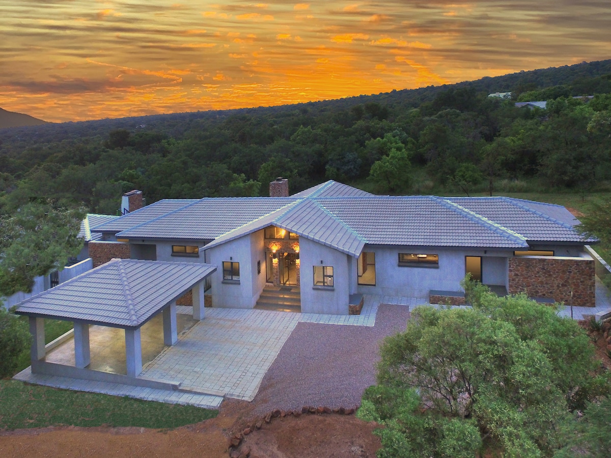 A beautifully decorated 5 bedroom lodge in the Waterberg just 2 hours from Johannesburg. All rooms are en-suite and private, and have their own patio. The house has a fully equipped kitchen, bar, lounge, dining room, fire pit and an enormous verandah for day naps! This home is an absolute gem with privacy, great relaxing spaces and unrivalled views of the Waterberg mountains. It's a great location to mountain bike and trail run, or just enjoy game-viewing from the comfort of the enormous patio.