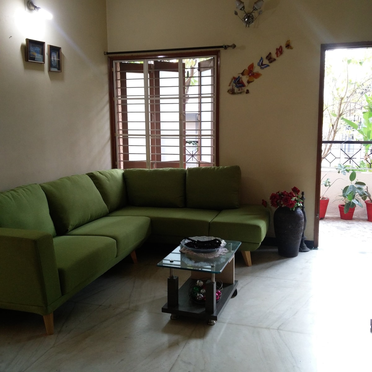 We only Host Families. Full furnished apartment in a gated community, with two bedrooms, a large family room with open terrace, dining area, and a fully equipped kitchen. Two full bathrooms, one attached and one common, both with running hot & cold water. Both bedrooms as well as the living room are equipped with AC. Kitchen equipped with refrigerator, RO for drinking water, microwave, induction cooktop, utensils, cutlery, crockery etc. and washing machine in wash area. 43" TV in living area.