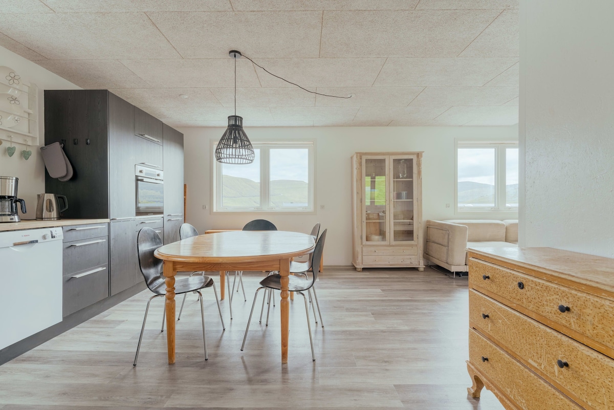 New unique apartment situated in Gásadalur next to the world famous waterfall "Múlafossur" There are beds for 6 people. The kitchen is fully equipped with dishwasher, oven, stove, microwave oven, coffee maker etc. Wi-Fi and TV is also available. There is also ventilation in the house ensuring continuous "Fresh air from the North Atlantic" Privat parking is behind the house.