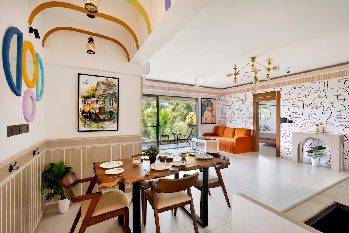 Experience this artistic, fully equipped apartment, just a 5-10min walk from Vagator Beach. Nestled in lush greenery and centrally located, it’s steps from popular clubs like Hill Top, Salud, & Raeeth, and 10 minutes from top restaurants like Thalassa, Purple Martini, and Baba Au Rhum. Curated by two Indian tattoo artists, it features modern amenities, a swimming pool, gym, and 24/7 security. Every corner reflects art, creativity, earthy tones, & a calming energy to help you relax and recharge.