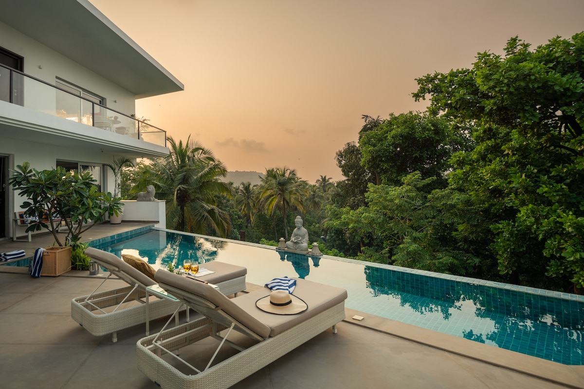 Luxury Private Pool Villa near Anjuna, Vagator Beach, Villa Divino is a chic 2.5-bedroom private pool villa in Anjuna, tucked into a lush, quiet green belt yet minutes from Goa’s hottest cafés, beaches, and nightlife. Just 1.5 km from Vagator Beach, Short drive to Anjuna Beach, right next to Assagao, easy drive to Morjim, Ashwem, Candolim and Baga, this bright villa sits in an exclusive gated compound, with 24/7 security, a private plunge pool, and a hill-view terrace in North Goa!