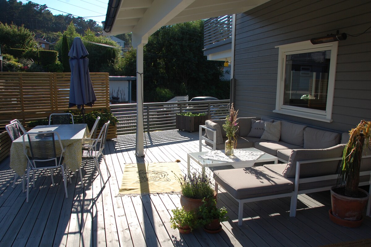Spend your holiday in our southern gem on idyllic Flekkerøy ☀️ Only 250 metres to the nearest beach! You rent the entire house – a modern two-storey home + loft, including a ground floor apartment (35 sqm) with its own kitchen and bathroom. Perfect for large or 2–3 families. Upper floor veranda with lounge furniture, dining area and gas grill. Apartment has private patio with charcoal grill. The house includes Wi-Fi, 2 streaming TVs, 2 kitchens, 3 bathrooms and a trampoline.