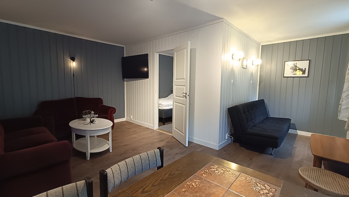 Modern apartment in scenic Bryggja, Nordfjord — built in 2022 directly above the fjord (0 m to the sea). Two bedrooms, balcony with sea and mountain views, full kitchen, fast Wi-Fi, washer/dryer, and EV charger. Swim or fish from the private pier just outside. Local artisan bakery 80 m away, supermarket within walking distance. A peaceful and stylish base for exploring Loen, Måløy, Selje, and the stunning fjords.