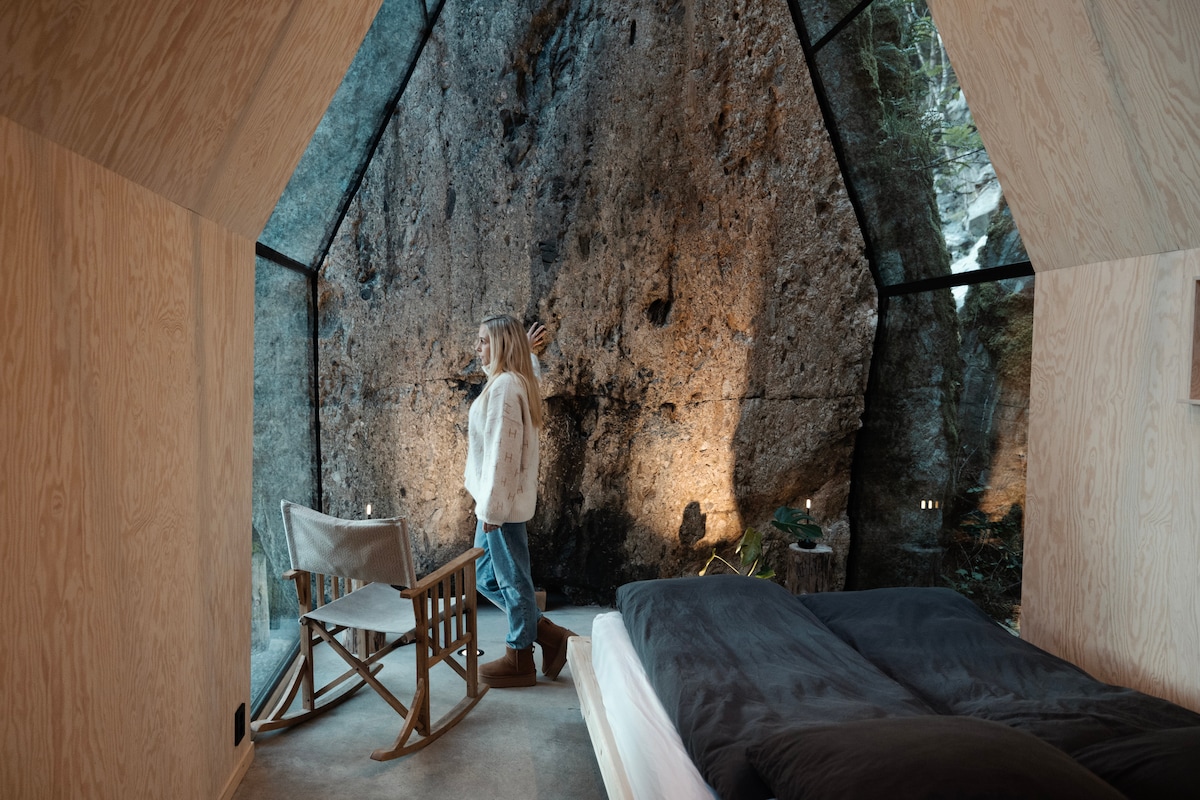 A romantic glamping retreat with breathtaking views over the sea and mountain Hornelen. The spectacular bedroom in the woods is an architectural masterpiece by it's windows merged into a giant stone. In a warm cozy bed you'll hear the forests’ sounds while touching geology, have cool Scandinavian design around you and maybe see the Northern lights or stars above you. The private, stylish and well-equipped apartment has all the comfort you ask for. This is what we call a getaway of a lifetime!