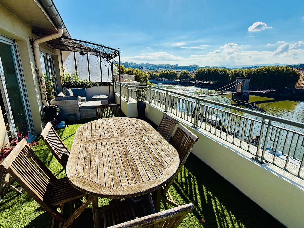 Rooftop unique avec vue 180° mont-Blanc & Lyon, terrasse 50m² complètement équipée, climatisation, 2 chambres, 2 TV, 2 salles de bain, TV, wifi fibre, bureau équipé dualscreen 67cm, décoration soignée, parking sécurisé et accés centre ville et gare de Perrache à 2 arrêts de bus.