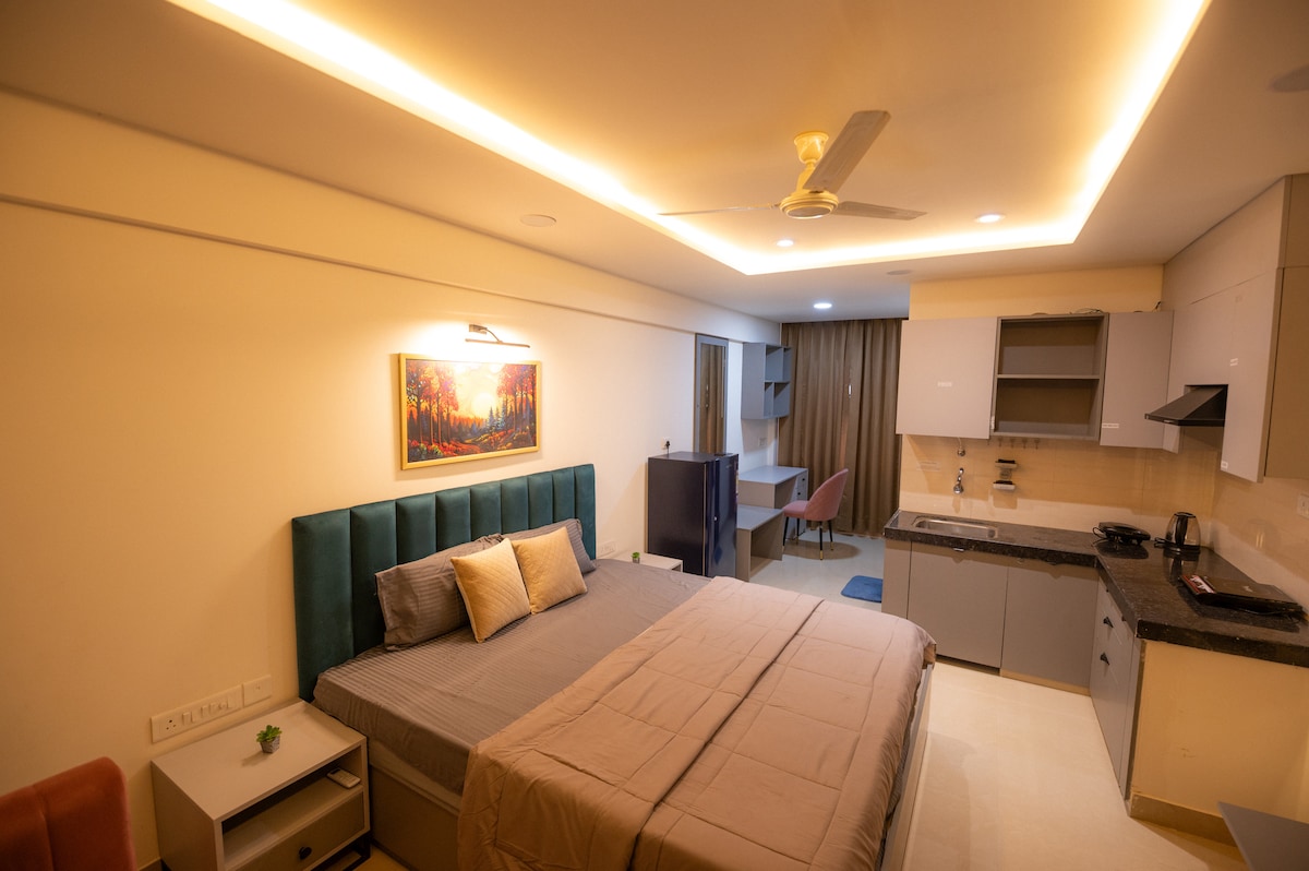 Experience a stylish designer studio in Jaipur featuring a luxurious king bed, elegant interiors, and modern amenities. Relax in the cozy lounge, stream on the smart TV, or work at the chic desk. Floor-to-ceiling windows fill the space with natural light and city views. A fully equipped kitchenette adds convenience for extended stays. Perfect for couples, solo travelers, or business trips seeking a luxury Airbnb in Jaipur with comfort, elegance, and central location.