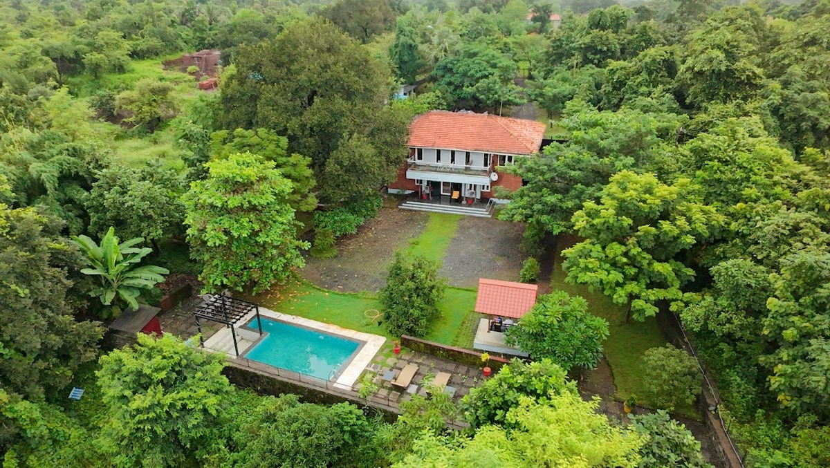 This is a beautiful serene 4 bedroom farmhouse with private pool. Get away from hustle and bustle of City Life and unwind in the lap of nature. This is a sufficient modern farmhouse with 4 Air conditioned bedrooms. Place has 2 common areas ( open and indoor). You will have access to functional kitchen. Place boasts a spacious terrace with bird eye view of green expanse around. Place has ample parking and good access to road. Ulhas river is close by which flows around the year.