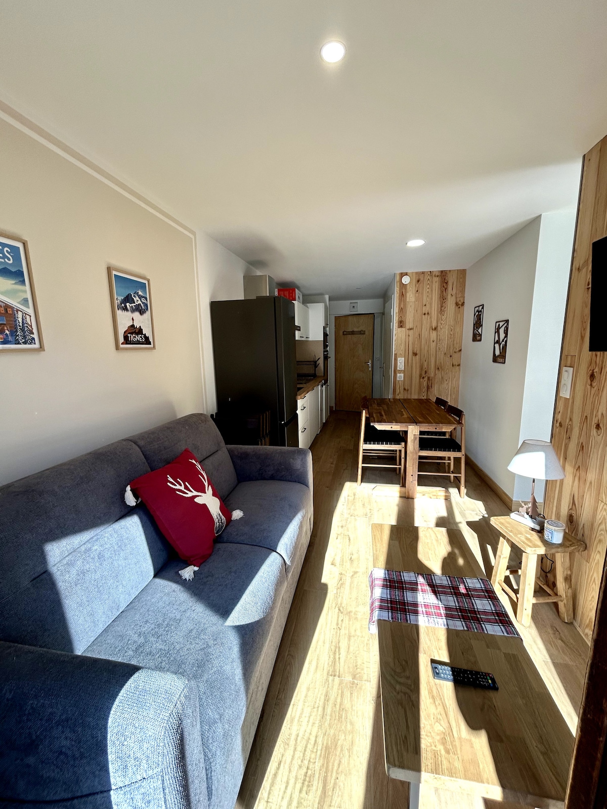 Studio cabine refait à neuf de 17m2, idéal 2 personnes, mais peut accueillir 4 personnes Il dispose de 4 couchages, un canapé lit double dans le salon, et 2 lits escamotables dans l'entrée A 2min à pieds des remontées mécaniques(150m) et proche de tous commerces, un arrêt des navettes gratuite est juste en bas de la résidence L'appartement dispose d'un lave vaisselle, cafetière, grille pain et bouilloire, ainsi que d'un casier à ski Les draps, serviettes et le ménage sont compris Wifi gratuit