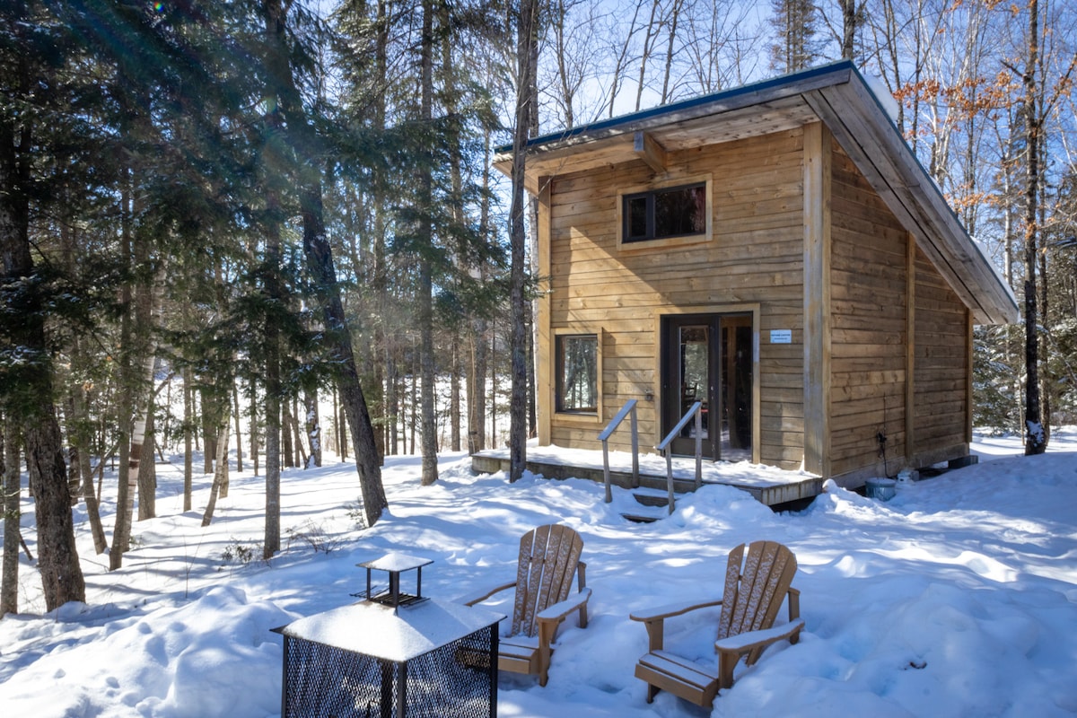 Welcome to La Khabine! This cozy, modern cabin comes with all you need to relax and connect with nature. Enjoy a glass of wine with the sound of a crackling fire in the wood burning fireplace. Take in the view of the forest through the surrounding floor to ceiling windows. Relax in the private outdoor cedar barrel sauna. Natural self-care products, firewood, laundry soap, and high-speed Wi-Fi are all complimentary. We hope you'll love our little cabin of windows as much as we do :)