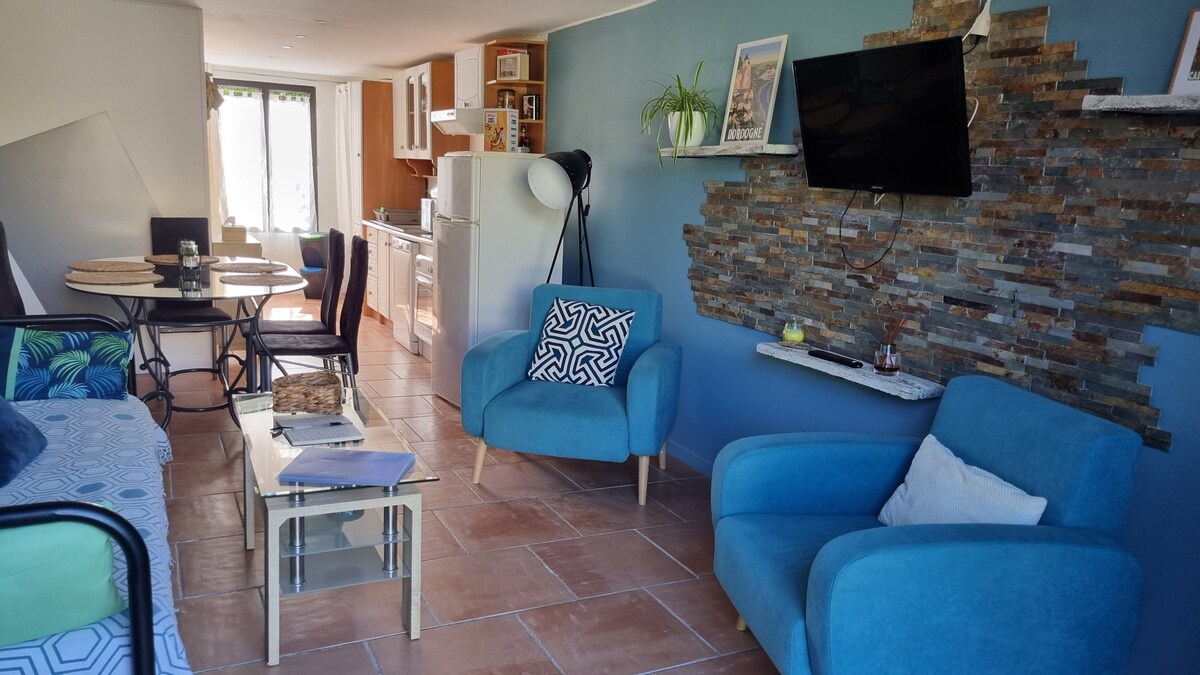 Bâtisse du 18ème siècle offrant un charmant logement indépendant de 35m2 entièrement rénové avec sa terrasse pour prendre un café au soleil le matin. Le studio est organisé autour d’une cuisine ouverte sur un bar en chêne avec un coin salon et TV connectée. La chambre avec literie Buletex et salle de bain en pierre. Vous serez au calme tout en étant à moins d’un kilomètre des commerces et baignades dans la Dordogne. A proximité des plus beaux villages de France, châteaux et jardins.