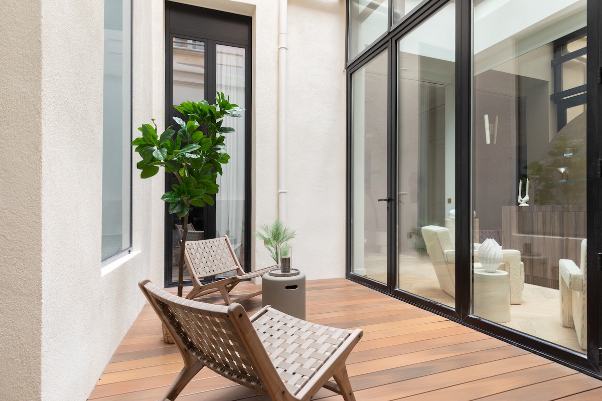 This beautiful loft is located on the 2nd and last floor of a magnificent 18th century condominium. In absolute calm, the apartment overlooks a garden and a tree-lined courtyard. It benefits from high-end equipment: private terrace of 15m2, sauna, air conditioning, custom furniture, king size bed, equipped kitchen, fireplace, sound system, retractable TV.