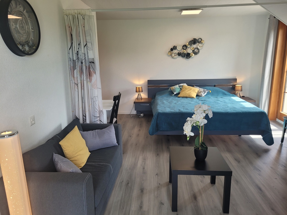 Studio Vineis - Charming accommodation on the ground floor of our house nestled in the heights of Vallamand, in the heart of the vineyards with a terrace offering splendid views of Lake Morat, the Alps, and the sunrise.