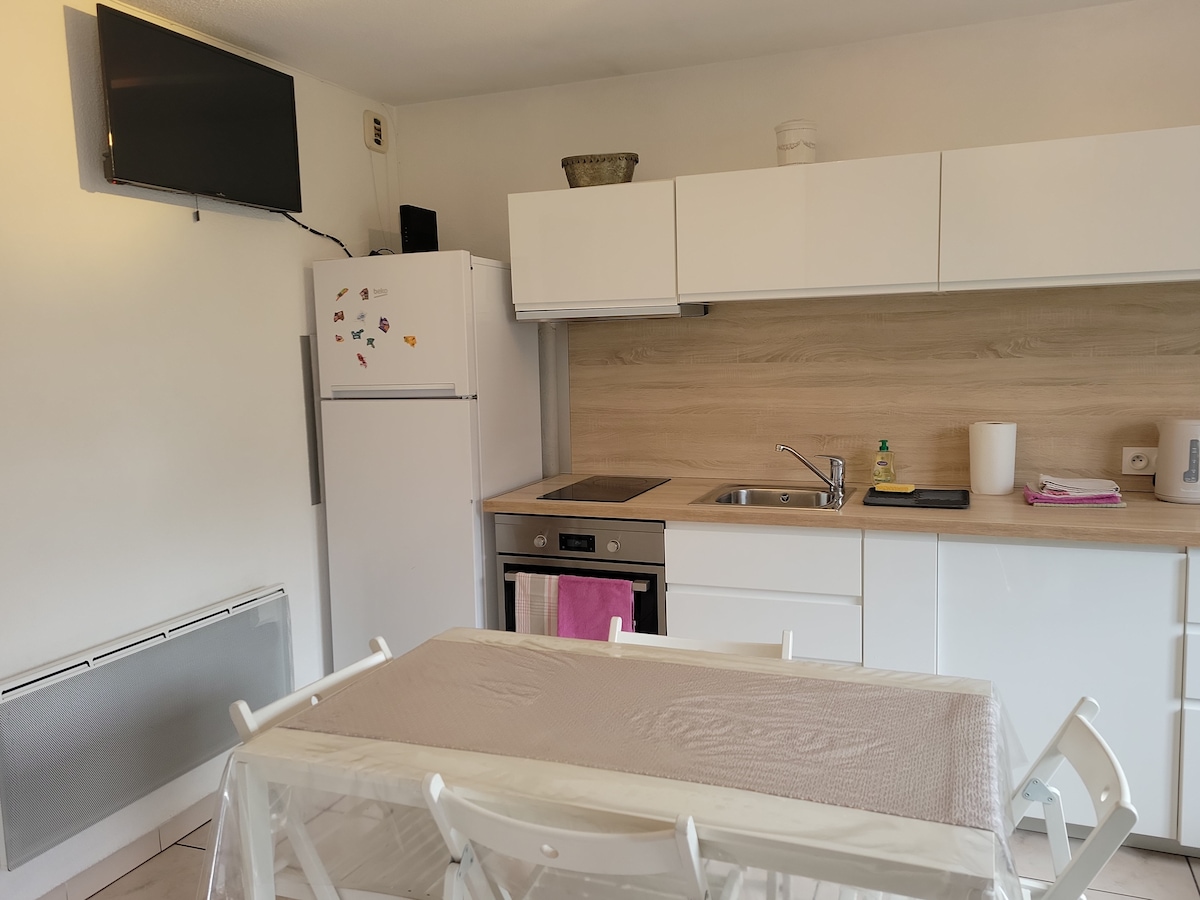 Agréable studio 32 m2, coin cuisine séparé de la pièce principale par un passe plat. ( lave-vaisselle, plaque vitrocéramique, micro-ondes). Pièce: canapé lit pour 2 , des lits gigognes, une table rabattable, une armoire, une télévision. Coin montagne: 2 lits superposés, placard Salle de bains rénovée (baignoire, lavabo, placards, lave-linge). balcon casier à skis emplacement de parking couvert. à 5 minutes des commerces, et près des pistes de ski.