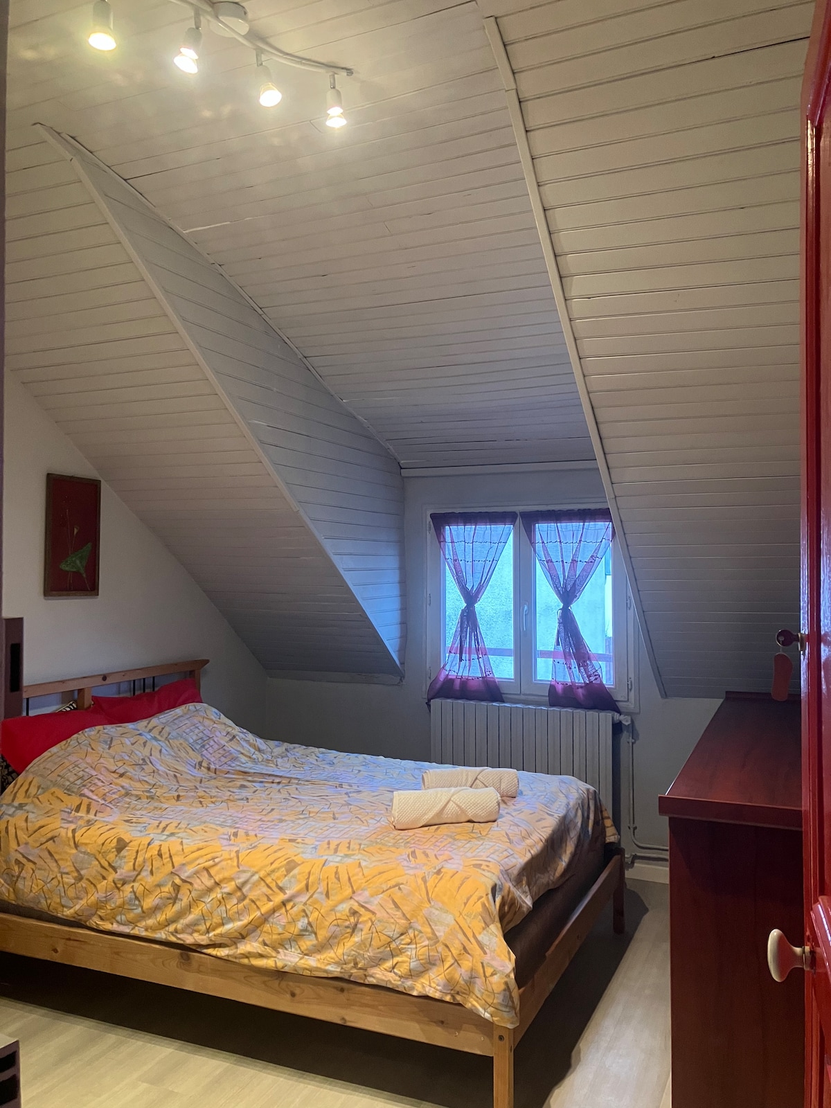 Maman vivant avec mes 2 enfants et un petit chien très gentil, je loue une chambre de 9 m2. La chambre est composée d’un lit convertible de 1 à 2 personnes, d’un bureau et d’une étagère. Vous aurez accès à la salle d’eau, à la cuisine, au séjour et au jardin. Les draps et les serviettes sont fournis. Le thé et le café sont à disposition. Ma maison se situe dans une résidence clôturée , à 5 minutes à pied de l’arrêt de bus en centre-ville.