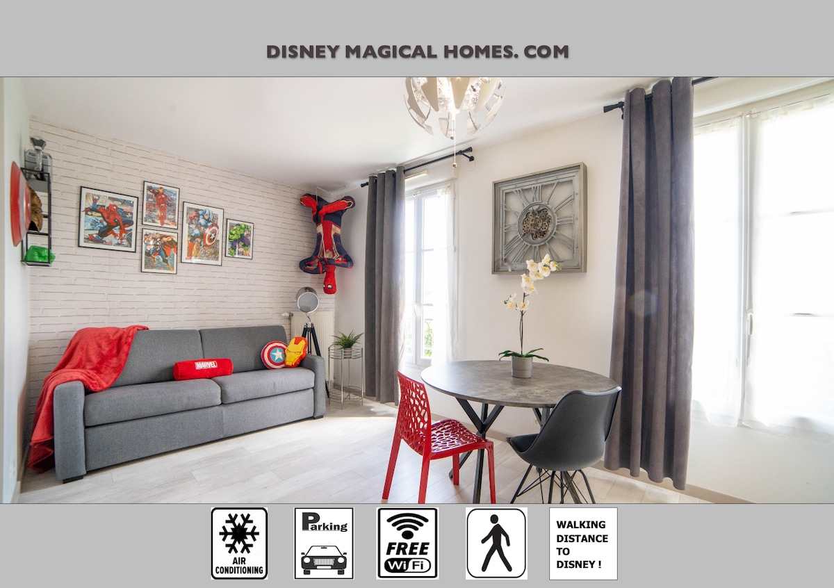 SPACIOUS APARTMENT View of Disney Fireworks, 10 minutes walk 3 bedrooms, 9 people 2 free parking spaces, for vehicules less than 2 meters high - bedroom1: queen size bed, baby bed, changing table, dressing room - bedroom2: 2 bunk beds, - bedroom3: convertible sofa - living-dining room: sofa bed, TV - equipped kitchen: fridge, microwave, oven, induction hob, extractor, kitchen utensils, kettle, toaster, coffee maker, cutlery - bathroom - WC WIFI optical fiber