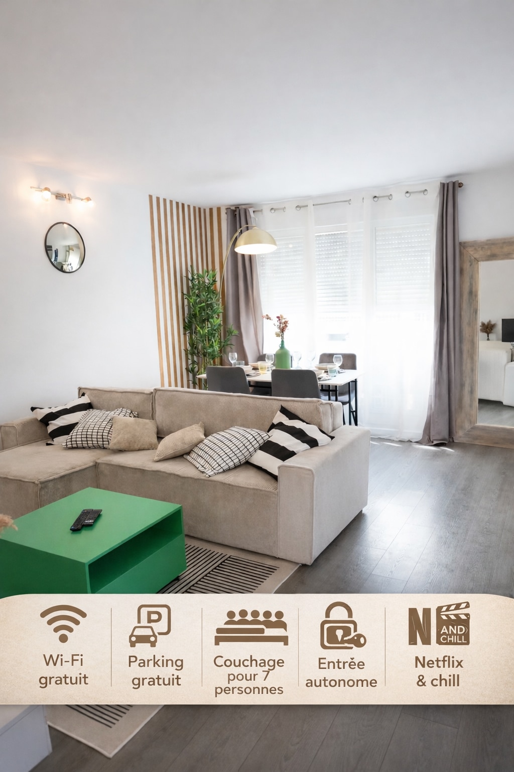 🏠 Appartement entier T3 avec balcon au rez de chaussée à 10 min de CDG & Villepinte 🍽️ Cuisine équipée (+ lave-linge) 🛋️ Salon avec Smart TV + canapé-lit (matelas 18cm) 🛏️ 2 chambres avec lits simples modulables en doubles + canapé-lit 1 place 🚿 Douche à l’italienne 👶 Lit bébé et équipements bébé sur demande 🔑 Entrée autonome 🅿️ Parking privatif sécurisé en résidence Confort et praticité au rendez-vous !