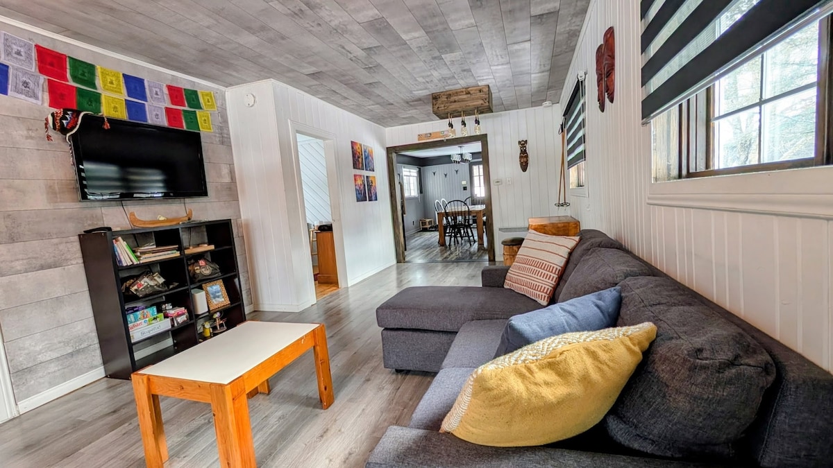 Chalet agréable, en aire ouverte, très bien éclairé par les fenêtres. La rive du lac est privée sur la largeur du terrain. Il y une agréable petite terrase adjacente. C'est un petit lac, à l'eau claire et plutôt froide, car elle vient principalement de sources souterraines. Sans embarcations motorisées (à essence). Terrain intime, avec beaucoup d'arbres. Place pour feu de camp. Forêt juste derrière, avec de beaux sentiers. Un sentier de motoneige est tout près.