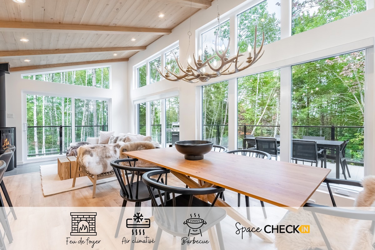 For your vacations choose the Chalet Horizon, an Eden in nature with a view of the mountains ♥ You will appreciate the chalet thanks to: ✷ Semi-private beach 5 minutes away ✷ Large private land, totally surrounded in pure nature ✷ Large bright windows with a view of the horizon ✷ Luxurious and comfortable spaces ✷ Spa open all year round ✷ Terrace equipped with a BBQ and gas fireplace ✷ Smart TV with speakers ✷ Indoor cozy gas fireplace ✷ Foosball table ✷ Wine bar