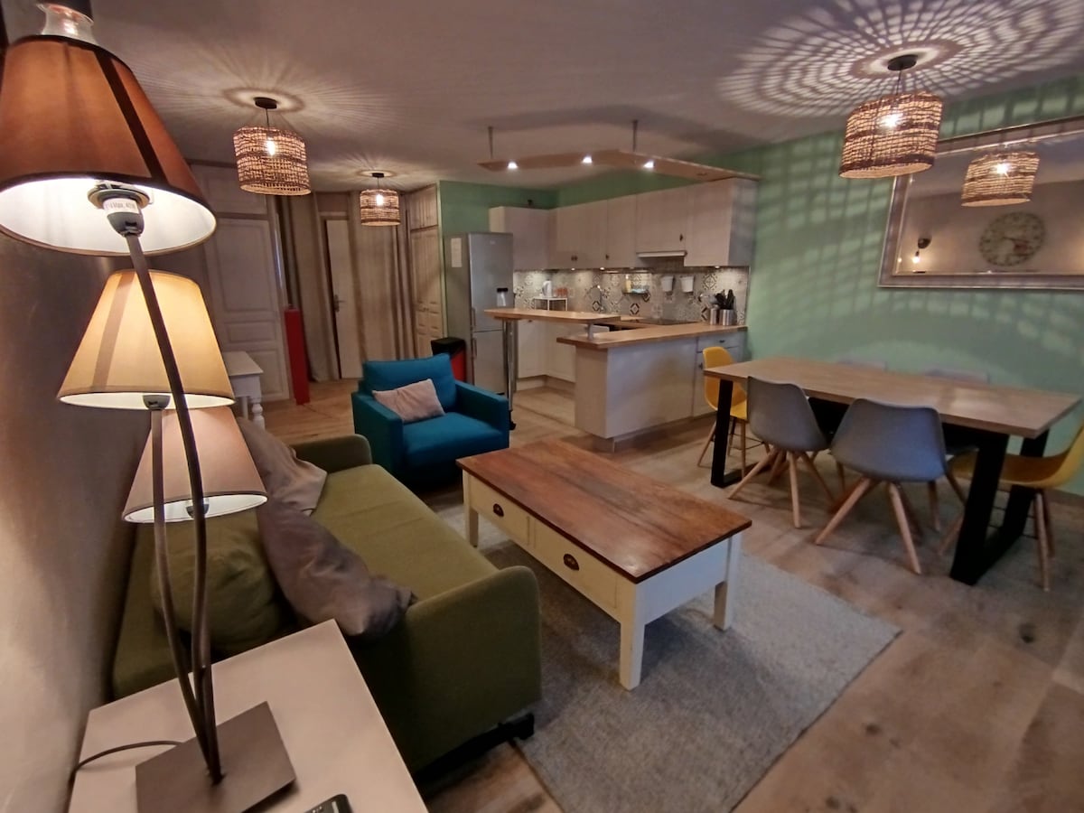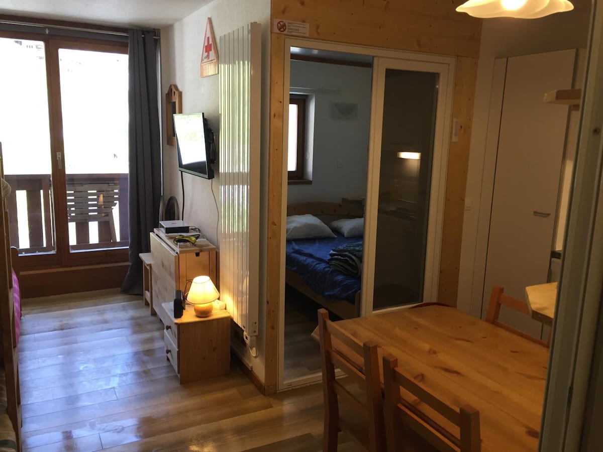Très bel appartement 4 à 5 personnes, très calme, départ et retour ski au pied. 1 chambre avec 1 grand lit double, 1 coin montagne avec deux lits simples, un canapé lit avec deux matelas. Equipement complet avec appareil raclette, crêpes, four, micro onde, lave vaisselle, cafetière, bouilloire, grille pain, sèche cheveux ... etc. WC indépendant. Accès commerces à 3 minutes. Wifi . Draps à disposition dans l’appartement en supplément et sur demande.