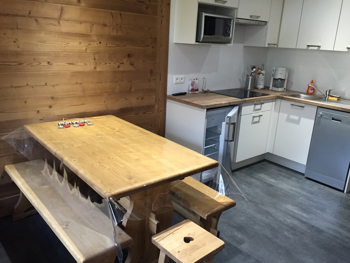 Residence Les Lauzières : 4 beds, skis on, renovated Ideally located between slopes and shops. ESF and snow front nearby. Completely renovated in 2022. Composition : double room (bed 160), cabin room with bunk bed (2 single beds), separate WC, bathroom (Italian shower), kitchen (dishwasher), lounge area (TV, free wifi). Unobstructed southern view on the domain. Keys and cleaning included. In option : bed linen, made beds, towels and cleaning kit