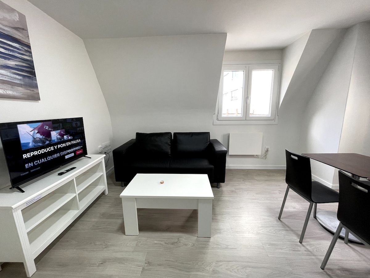 Loft rústico a pie de calle con entrada independiente, en el corazón del barrio antiguo de Bouzas a 50 metros de la playa con agradables zonas de paseo (Ej: Museo del Mar 15min andando). Distribución: - Espacio abierto con cocina, comedor, salón con sofá y tv, y cama doble (160x200cm). - Habitación con cama doble 135cm. - Amplio baño con ducha. Supermercados, farmacias, bancos, panaderías, bares y taperías alrededor. Ruidoso a veces. ⛔ Prohibido Fumar. Paradas de bus y taxi a 50 metros.