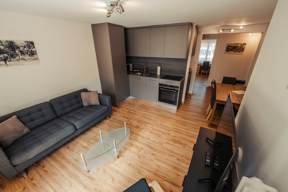 This charming 3.5-room apartment is located in the center of the village and is a true gem of Kandersteg - directly on the mountain river. The apartment offers two cozy bedrooms, a spacious living room and a bright, unique gallery. The semi-open kitchen is spacious and well-equipped, ideal for those who appreciate contact with the living area. The apartment's two balconies are particularly noteworthy. Both balconies offer an impressive panoramic view of the mountains.