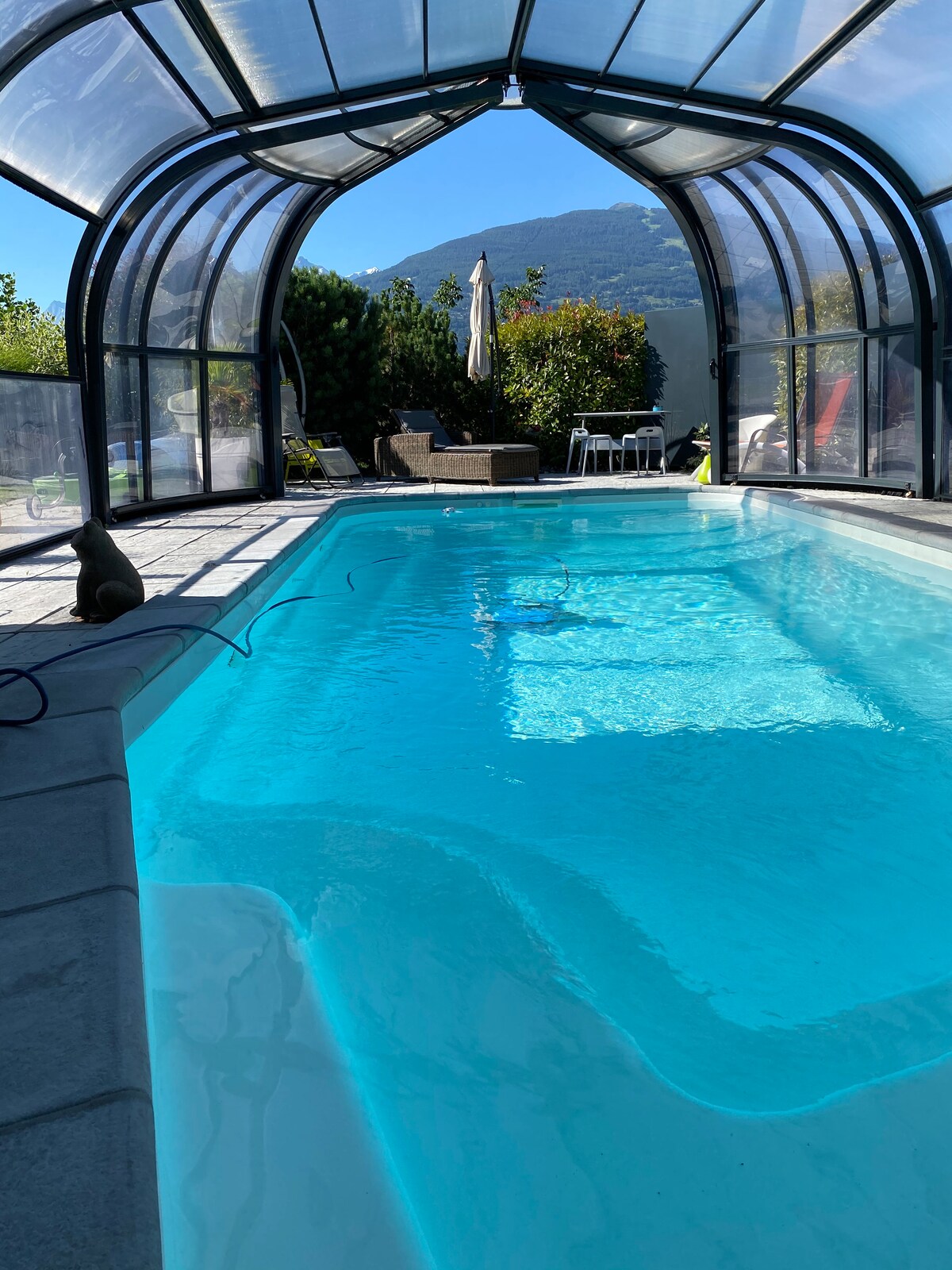 Détendez-vous dans ce logement calme et élégant aménagé avec goût, doté d'un grand lit confortable au format 2x80x200cm. A la belle saison, la 1ère terrasse côté soleil levant avec barbecue et mobilier de jardin, et la 2ème terrasse côté soleil couchant pour des soirées agréables. Cuisine équipée complète avec lave-vaisselle. Vous pourrez regarder la télévision sur le lit double aménagé de coussins confortables. CERM de Martigny à 5 km. Parking gratuit sur place.