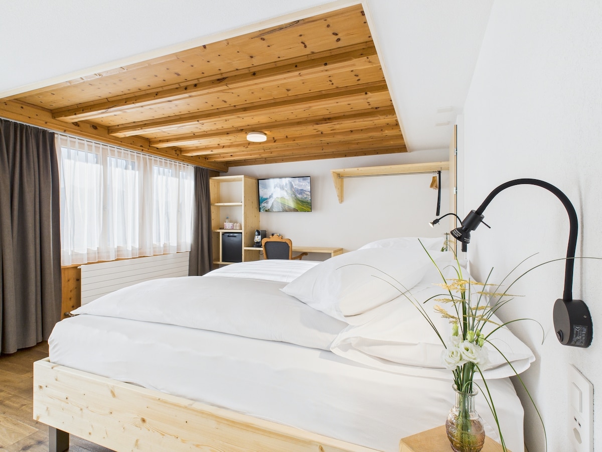 Entdecken Sie unsere neu renovierten Zimmer, die mit Parkettboden im charmanten Chaletstil ausgestattet sind. Jedes Zimmer strahlt rustikalen Charme und Gemütlichkeit aus, während moderne Annehmlichkeiten für Ihren Komfort sorgen. Erleben Sie den einzigartigen Charme der Berge in unseren frisch renovierten Zimmern und geniessen Sie einen erholsamen Aufenthalt inmitten der atemberaubenden Natur.