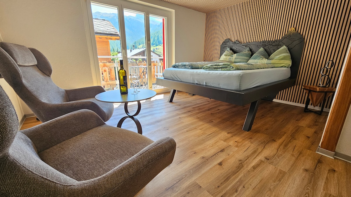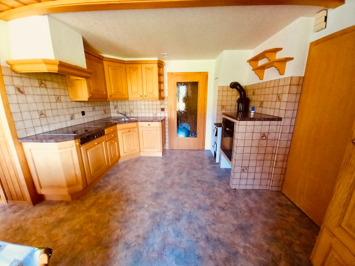 Relax in this luxurious, quiet, child- and dog-friendly flat above the Safrandorf Mund in the Valais. Situated 1400 metres above sea level, you have a fantastic panoramic view of the mountains, the valley below and a clear view of the Matterhorn. In winter, away from the hustle and bustle of the pistes, but still only 25 minutes away from the ski area, you can go snowshoeing, sledding or build an igloo. In spring, a super hiking area with the Aletsch glacier, Safrandorf Mund, famous suonen ...