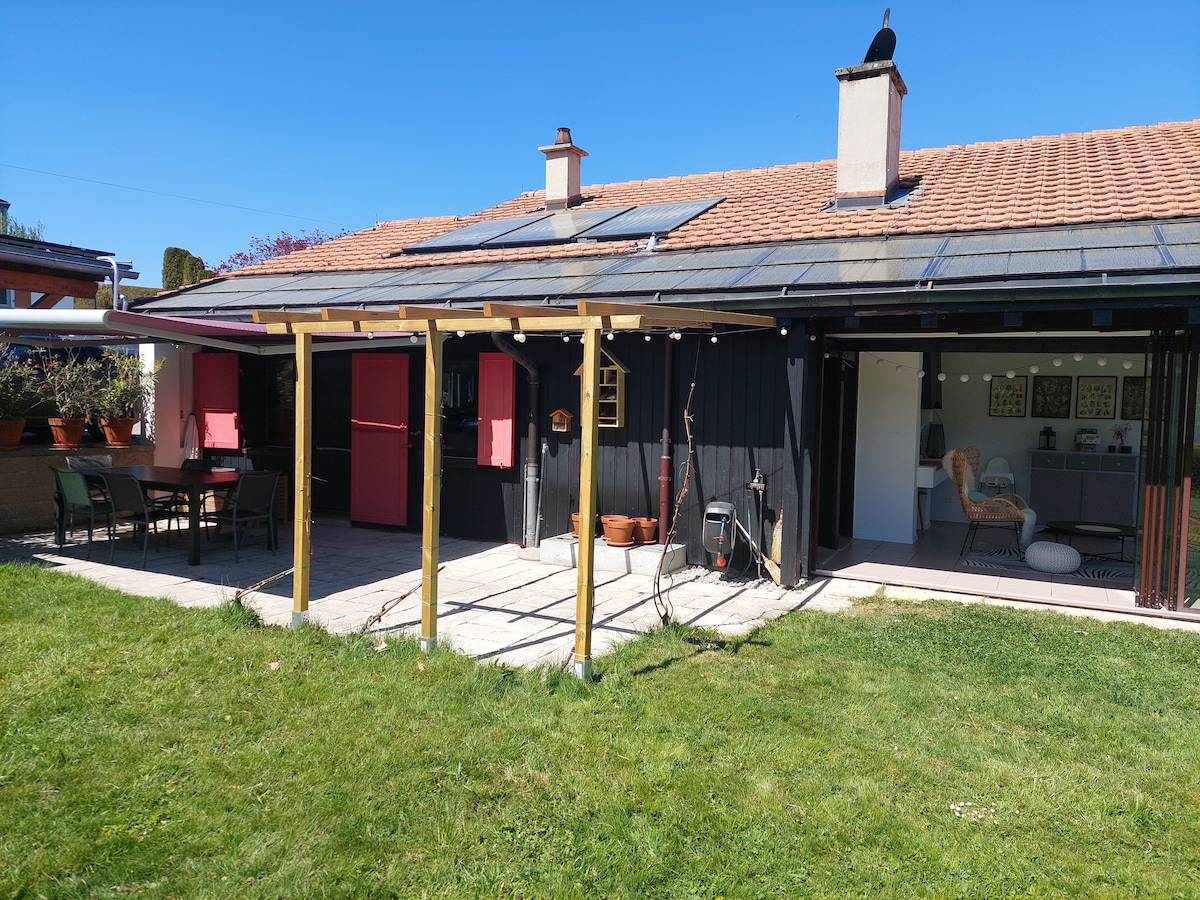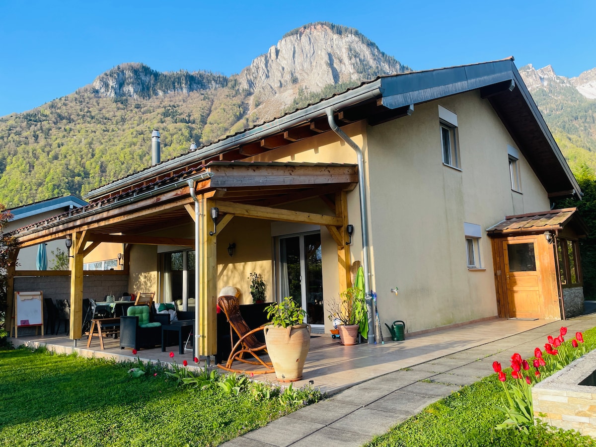 Entre lac et montagnes ! Le logement est situé au rez-de-chaussée d'une villa de 2 appartements et dispose d'une grande terrasse privative au calme. Vous pouvez facilement rejoindre le bord du lac (à 3,5 km) à pied ou à vélo en empruntant les pistes cyclables au bord du Rhône. La villa est le point de départ idéal pour faire des randonnées, découvrir l'incontournable Lac de Taney ou aller au sommet du Grammont. Nous mettons gratuitement à disposition des vélos.