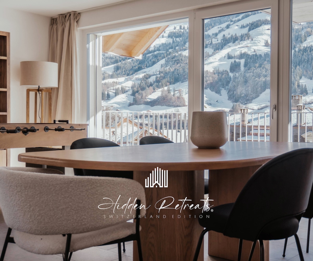 Penthouse studio with 100m2 terrace, uninterrupted views of the Alps and PRIVATE hot tub. Indoor space composed of an open living and dining room with a folding murphy bed (180cm), large screen TV, full bathroom and a cozy office. The kitchen has everything you need. Outside, the terrace and views await. An outdoor dining table, hammock and fire bowl invite you to relax. Close access to Gemmi & Torrant cable cars and thermal baths.