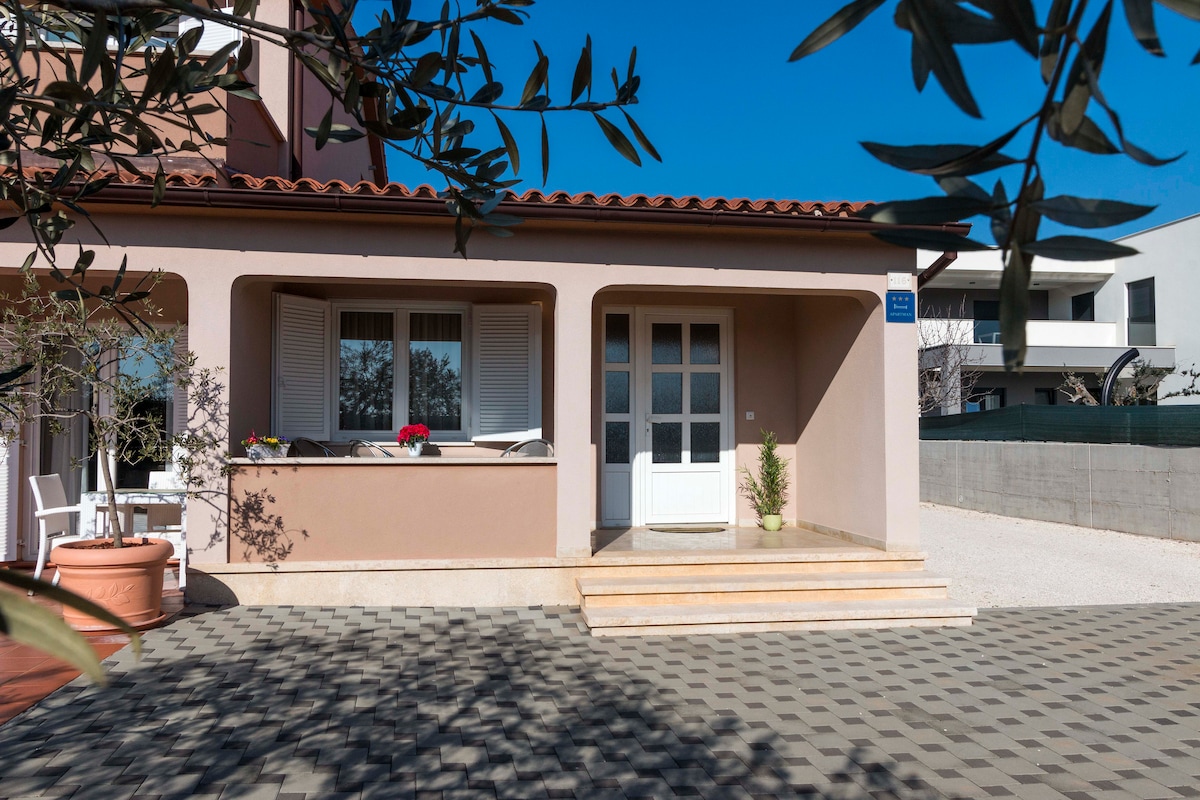Uživajte sa svojom obitelji u ovom modernom smještaju. Dobro došli ste kod nas, kuća se nalazi samo 200m od plaže! Imamo veliku terasu sa roštiljem za vas ,tu je i ogroman vrt sa parkirnim mjestom. Kuća je dobro opremljena sa svime što je potrebno za ljetovanje. Pored kuće imamo i vanjski tuš i još jednu prostoriju za peglanje i još jedan wc! kuća se nalazi na mirnom mjestu okružena zelenilom!