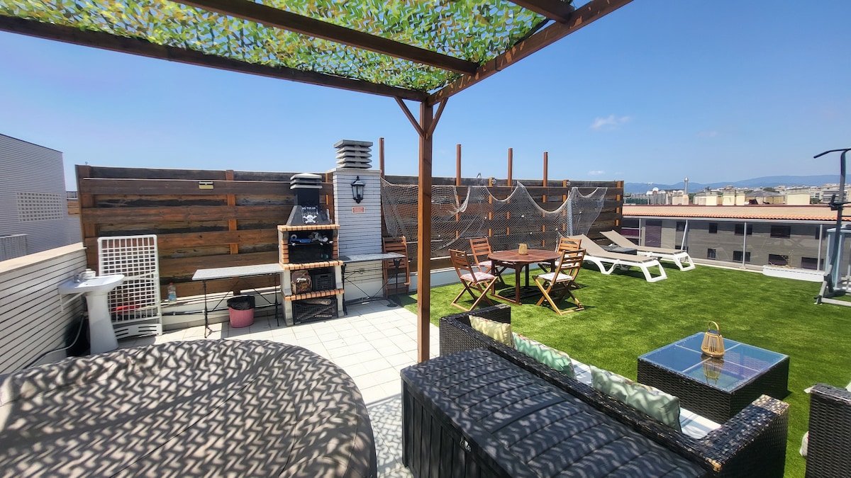 顶层公寓+露台、游泳池、停车场、烧烤、按摩浴缸