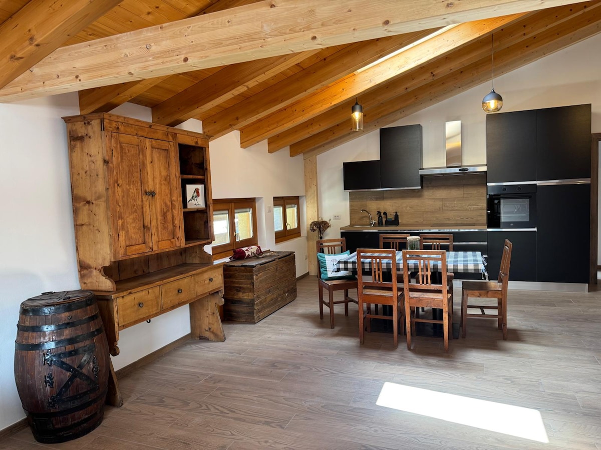 Nestled in the tranquility of the mountains, just 5 minutes from Bormio, this cozy attic apartment is equipped with every comfort. The recently renovated apartment has an open kitchen, living room with sofa bed, two bedrooms and a comfortable bathroom, and can accommodate up to 6 people. The living room leads to the balcony, which offers a panoramic view of the Alps. The property, surrounded by greenery, is the perfect retreat for relaxing.