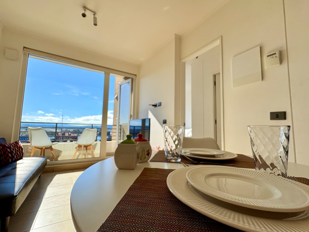 Disfruta de la comodidad y estilo en este departamento full equipado, ubicado estratégicamente con acceso a Av. Picarte y Costanera, a solo minutos del centro de Valdivia. - Living comedor. - Cocina full equipada: horno eléctrico, campana, microondas, lavavajillas, refrigerador, hervidor, tostador, cafetera y licuadora. - Baño con termo eléctrico, plancha, secador de pelo y toallas. - Dormitorio con cama de dos plazas. - Terraza. - Wifi 800mbps - Estacionamiento techado al interior del edificio.