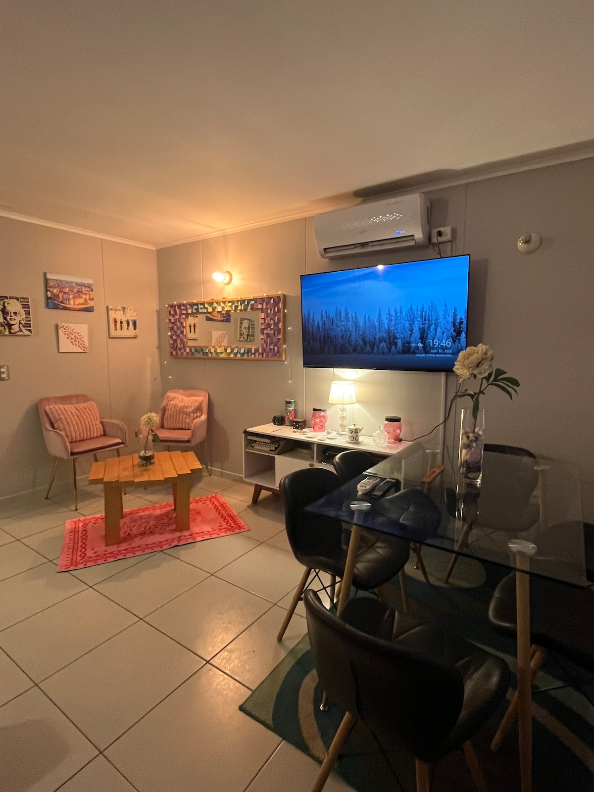Pieza independiente para 1 o 2 personas. Cuenta con una cama matrimonial, baño privado, muebles de ropa, television, wifi. Además, cuenta con cocina independiente, refrigerador, hervidor de agua, vajilla y lo que necesitas para cocinar. La entrada es independiente, queda cercano a supermercados y locomoción que va a niebla fuera de la puerta. La distancia de la casa al centro de la ciudad es de 15 minutos en vehiculo o Uber $3500 o USD 3,5. Tenemos un perro que nos acompaña, muy jugueton