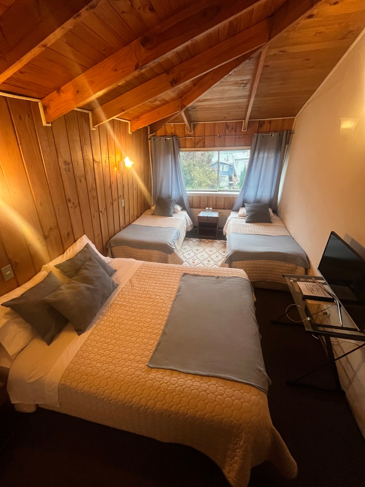 Habitación con capacidad para 3 personas ubicado en el 3er piso del Hotel, posee amplia vista al rio con cama matrimonial + cama de 1½ plaza en la misma habitación, con baño privado, calefacción eléctrica, Smart tv/Wifi y con estacionamiento en la recepción. NO Tiene tinaja privada