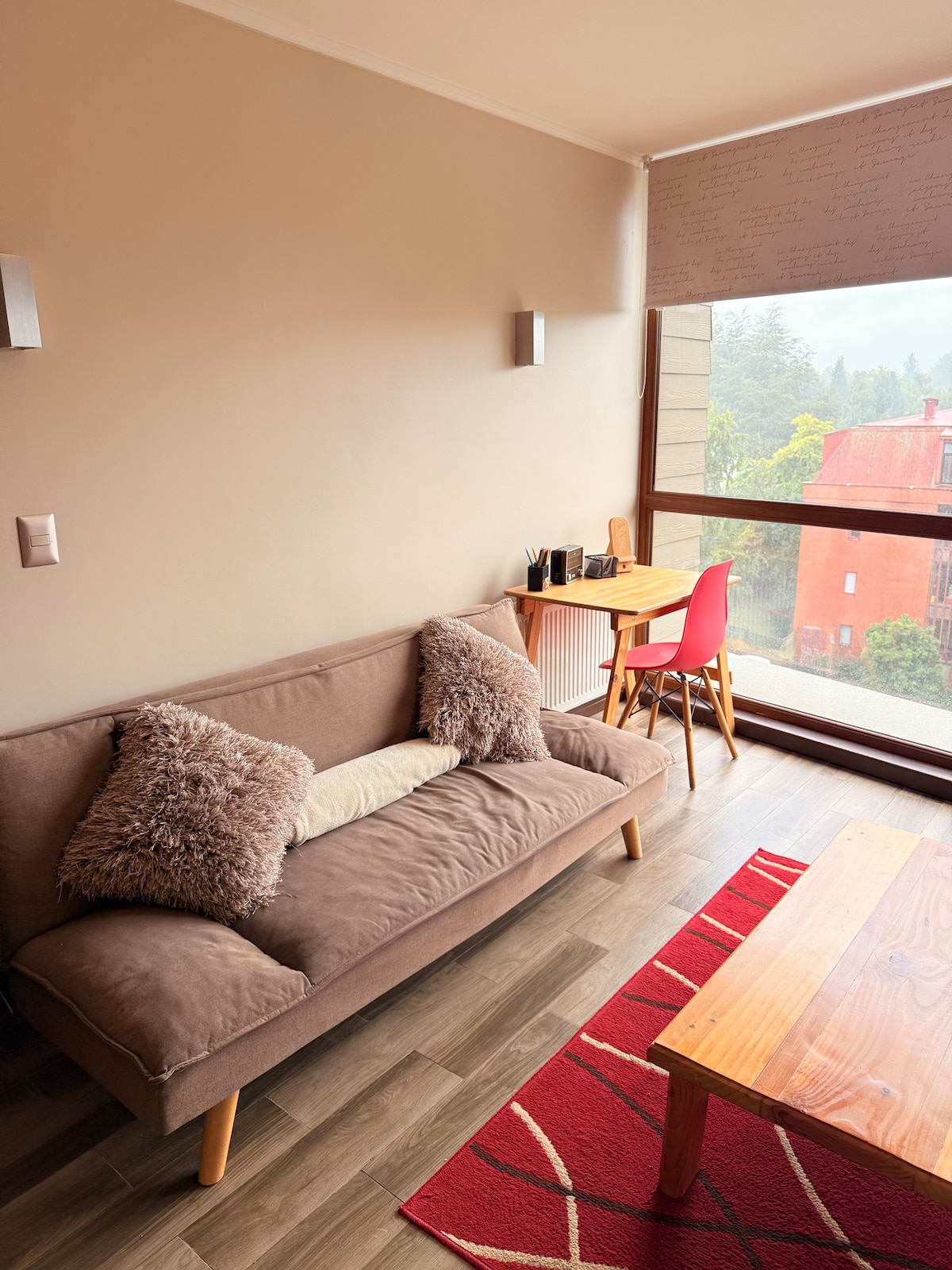 ¡Tu base ideal en Valdivia! Disfruta de este moderno departamento en el piso 6, ubicado a minutos caminando del centro, parques y la mejor gastronomía. El espacio es fresco e iluminado, equipado con Wifi de alta velocidad, Smart TV y seguridad 24/7. Contamos con estacionamiento privado (sujeto a reserva y pago adicional) y opciones gratuitas en la calle según disponibilidad. Además, el edificio ofrece servicio de lavandería de pago. ¡Vive Valdivia con todo cerca y reserva hoy!