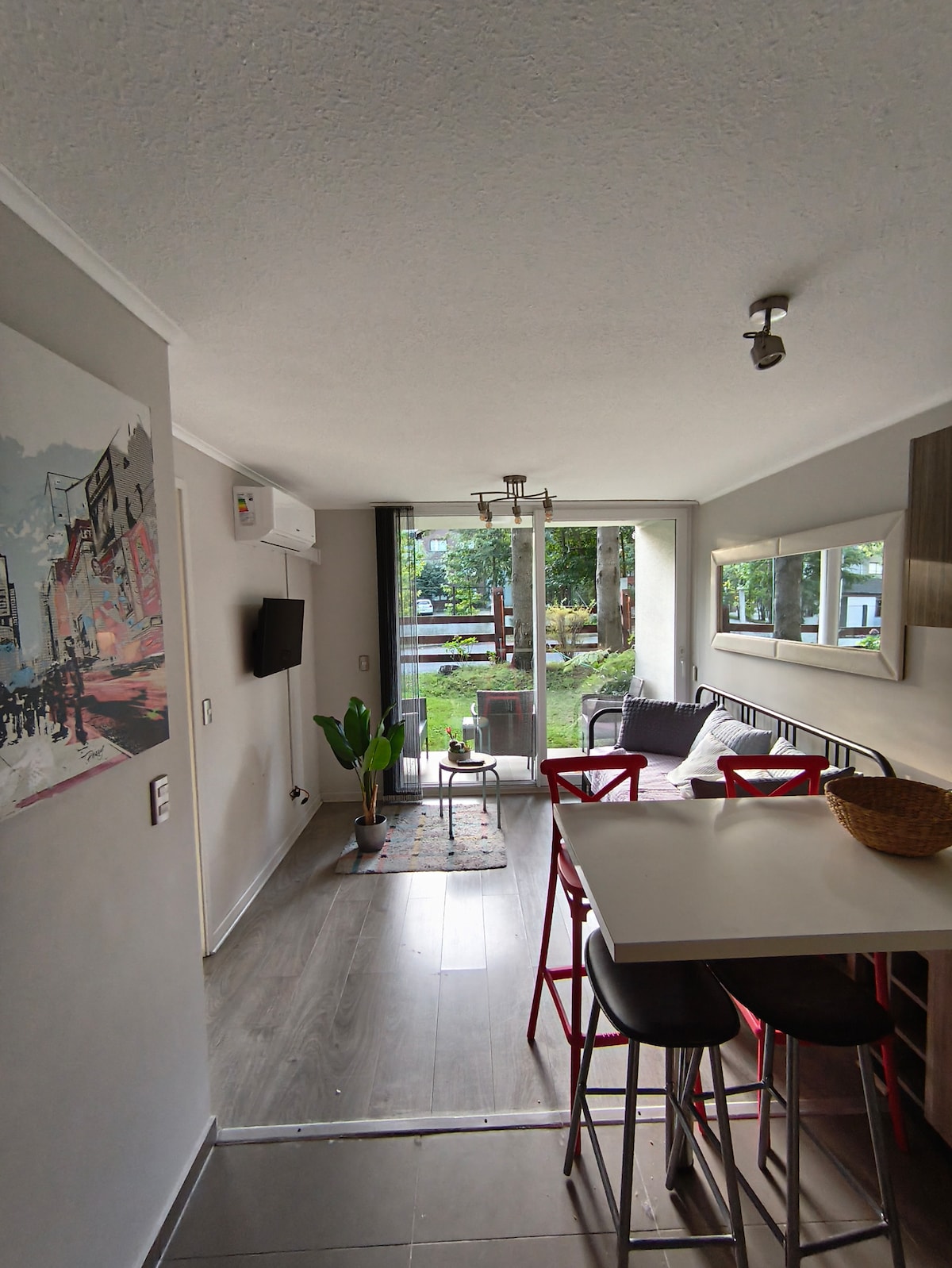 Cozy one-bedroom apartment with en-suite bathroom, living-dining area, and open kitchen, located in a private condo with beautiful gardens. Perfect for 2 guests. Enjoy: 🏊♂️ Pool suitable for kids and adults 🏰 Playground for children 🌲 Club house 🧖♂️ Sauna and hot tub (extra fee) 📍 Ideal location, close to: 🏘️ 5 min from downtown Pucón 🏞️ Beaches ⛷️ 25 min from the ski center ♨️ 40 min from Huife hot springs 🌿 25 min from botanical thermal park 🌄