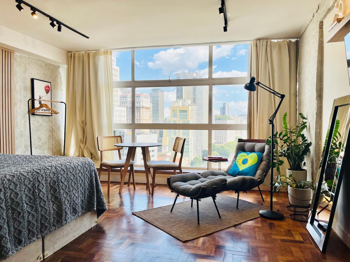 Estúdio dos sonhos com vista incrível para o Vale do Anhangabaú no Mirante do Vale, o prédio do Sampa Sky. Venha em família, pois nosso espaço acomoda, confortavelmente, 4 hóspedes. Wi-fi de alta velocidade, mesa de trabalho, Smartv, cozinha completa, cama queen, roupas de cama de alto padrão, ar condicionado, vitrola com LPs. uma vista única da cidade, além de um lindo mural exclusivo na coluna, feito pelas mesmas artistas que estapam vários murais pela Vila Madalena irão te encantar.