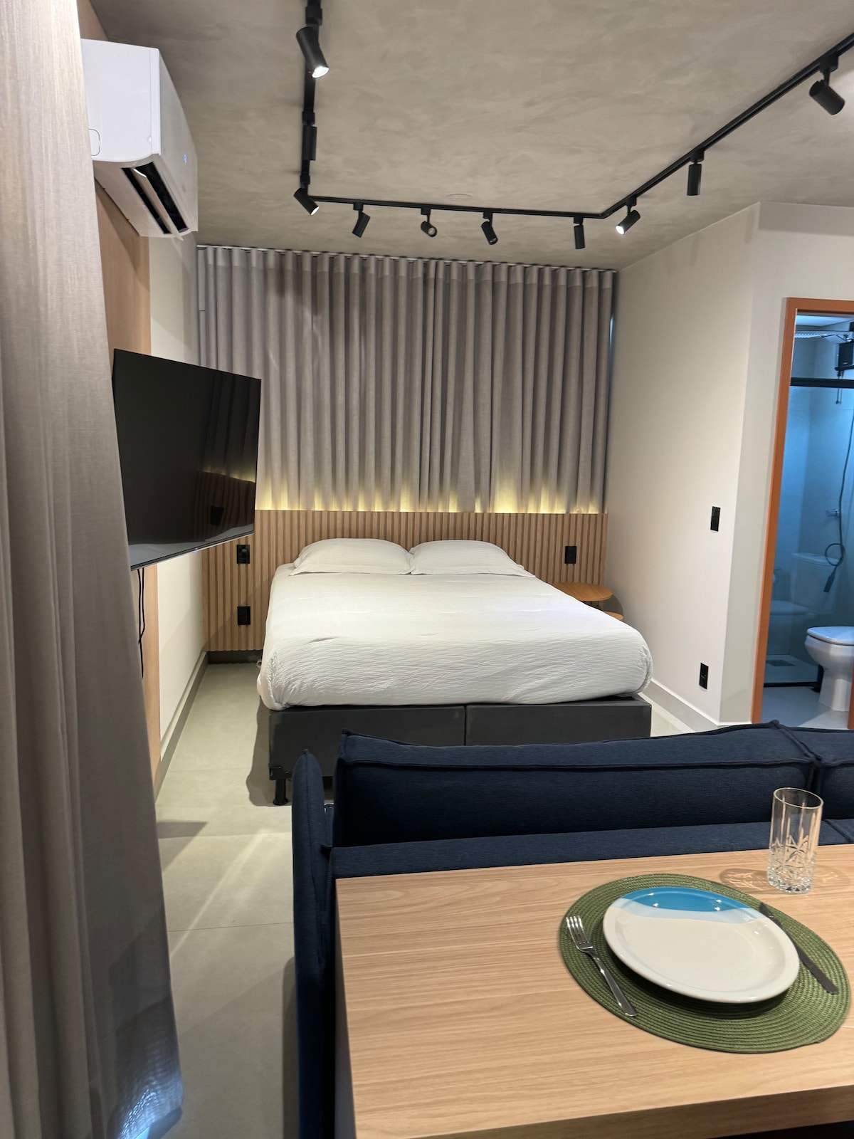Studio Ópera é completo e cheio de charme no 3º andar, com uma vista linda e ambiente acolhedor. A cama queen e sofá cama são confortáveis com ar-condicionado e SmartTV que garante bem-estar. A cozinha está equipada com utensílios, liquidificador, sanduicheira e cafeteira com pó de café de mimo, porque aqui, cada detalhe importa. Ideal para até 3 hóspedes, o espaço oferece enxoval completo com toque de hotel boutique, pensado para quem valoriza conforto e praticidade.