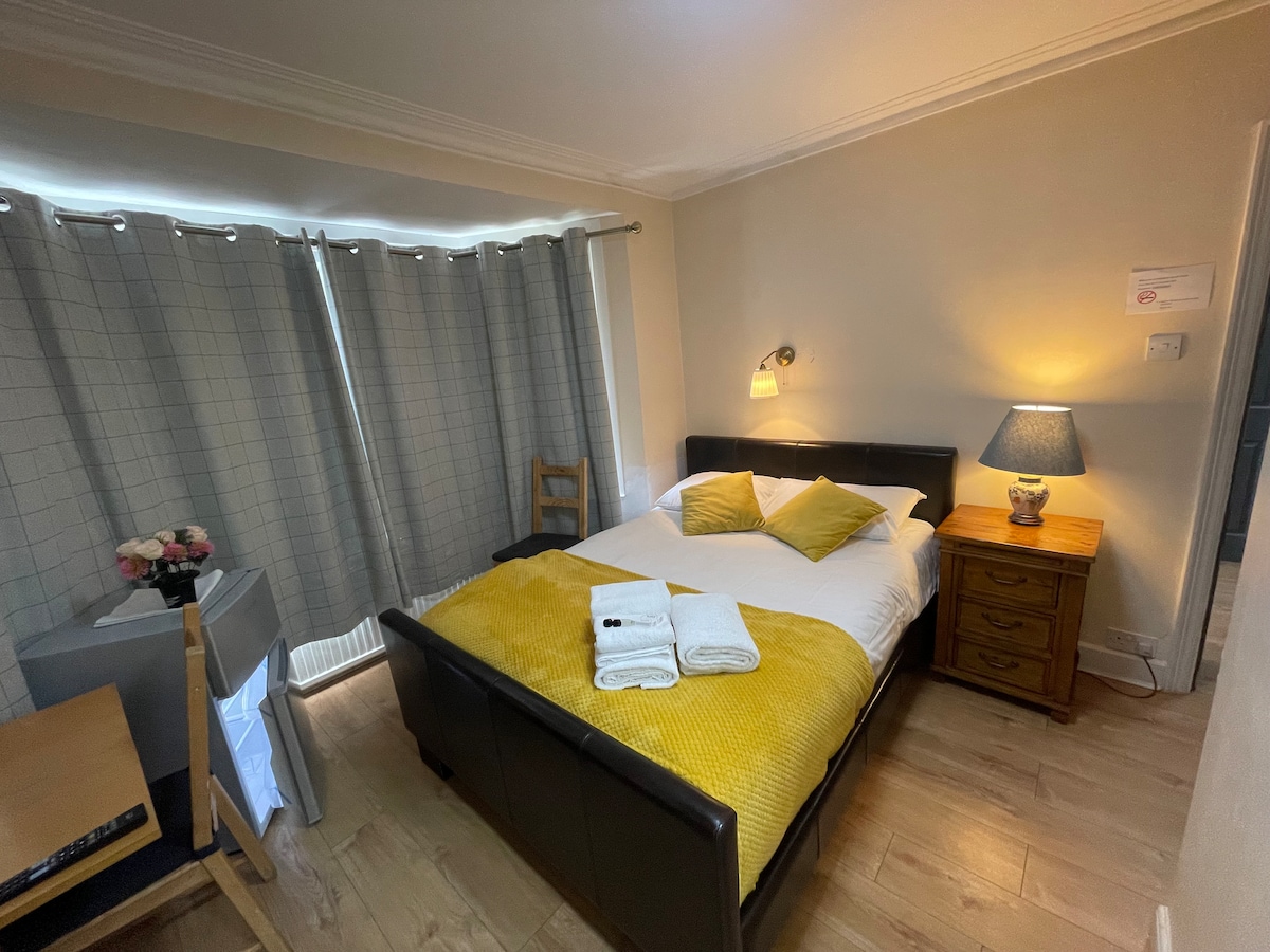 This ensuite bedroom at Riverside House Hotel in Cirencester offers a luxurious kingsize bed, Bunk Bed, a desk for work or leisure, and a flat-screen TV. It includes a private ensuite bathroom for added convenience and privacy. There is ample hanging space for clothes, making it ideal for longer stays. Guests can also enjoy access to a communal lounge area, providing a comfortable shared space to relax. Perfect for both business and leisure travelers.