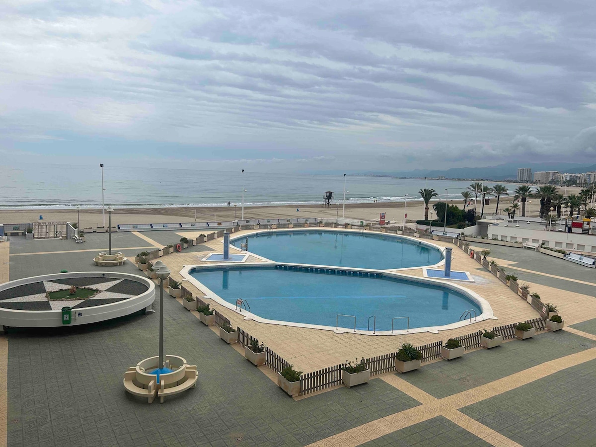 Apartamento con mucha luz , tranquilo y la terraza con bonitas vistas al mar y a las piscinas . Tiene pistas de tenis , pista de frontón , jardín infantil , zona ajardinada y club social y en los meses de verano también tenemos un bar restaurante abierto . Muy cerca de la playa ( a 3 minutos de la playa andando ) Acceso directo desde la autovia V21 y a 12 minutos de Valencia en coche .