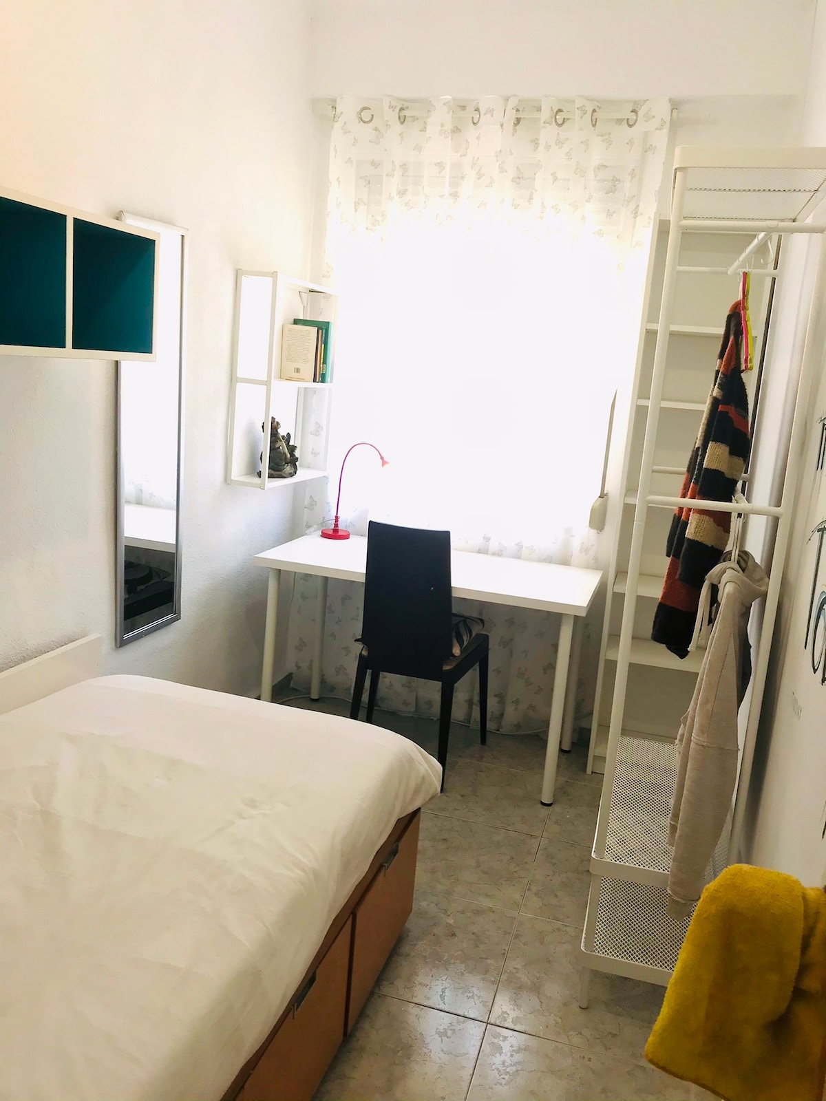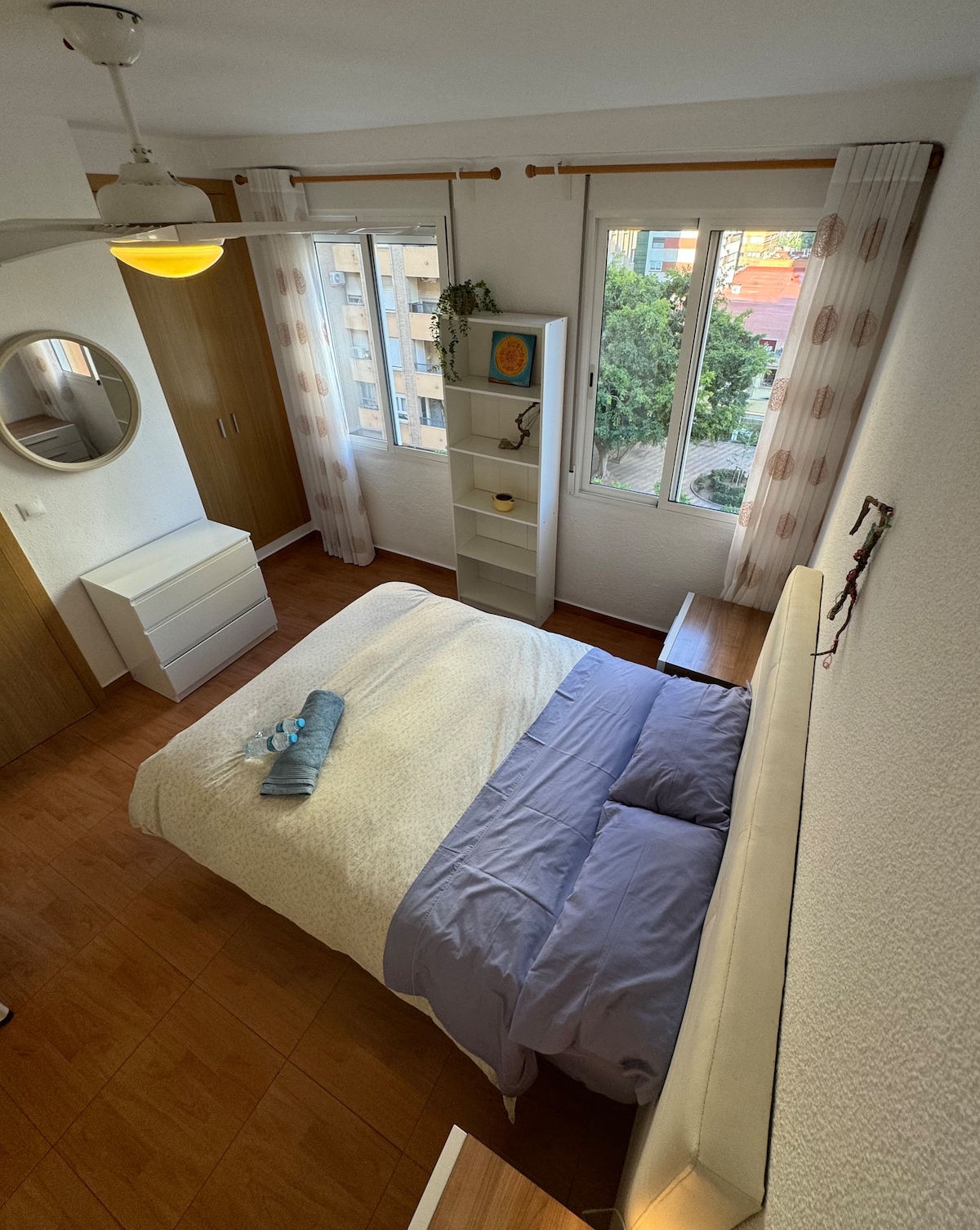 El piso esta muy bien equipado. La habitación es grande, tiene mucha luz de día y baño privado. El piso es compartido, tiene 3 habitaciones en total que comparten las zonas comunes. Esta ubicado en la zona de Mestalla, a dos minutos a pie del parque del Río Turia, 15 minutos caminando al centro (ciudad histórica) y muy cerca de la zona universitaria. Hay parada de bus y de metro justo abajo del piso.