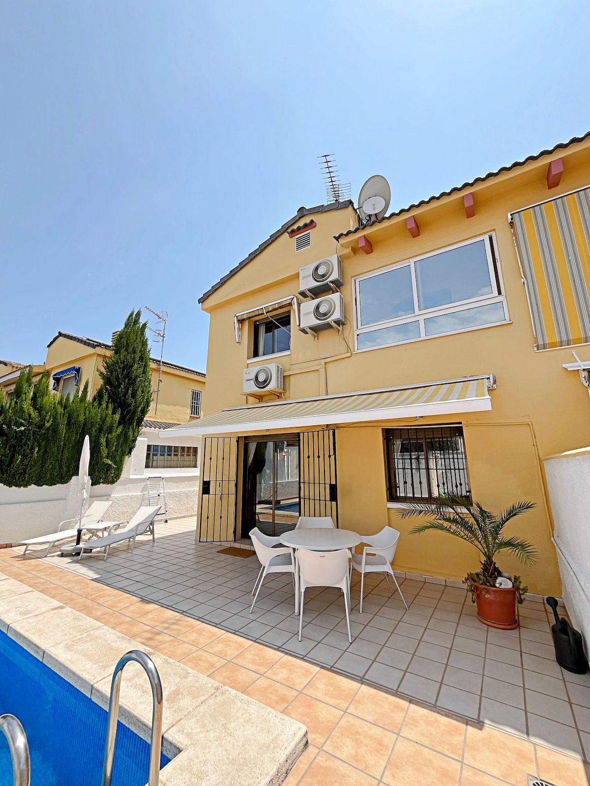 3 floor townhouse facing the sea with private pool, with sea views. Located on a beach with blue flag quality water. Flat with porch, three bedrooms, three bathrooms, three terraces. Double bedroom with terrace overlooking the sea. Double bed, four single beds. Porch with outdoor dining table with sofa and chairs. Perfect for digital nomads. Enjoy the sea breeze on the terrace eating a Valencian paella.