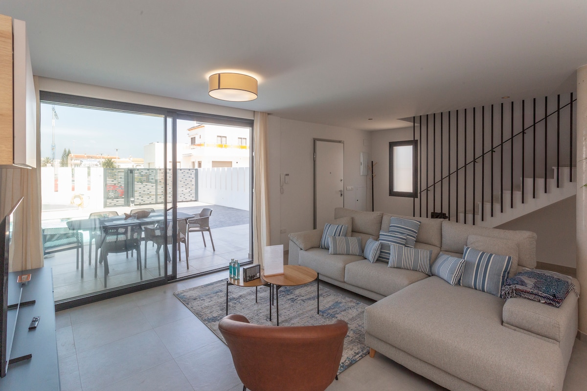 Adosado a 150m de la playa. a 35min de Valencia. Situado en una calle privada. Supermercados, bares y zonas comerciales a menos de 15min. A menos de 100m hay un parque para los niños y para jugar al tenis de mesa. Cuenta con 3 Habitaciones. 1 de matrimonio con acceso a terraza y dos habitaciones con camas individuales. La vivienda cuenta con ventiladores y aire acondicionado. Cocina totalmente equipada, ropa de cama y toallas. No se permiten fiestas ni animales domésticos.