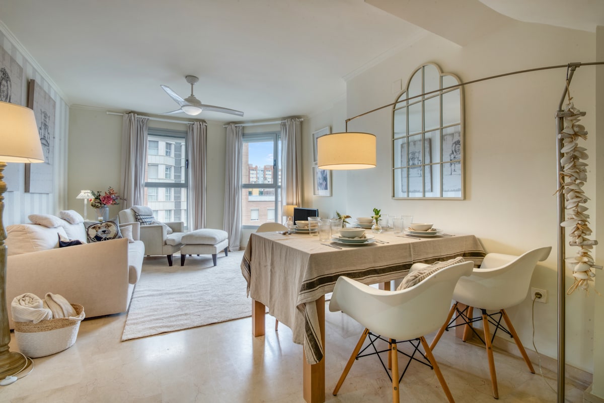 Stylish 100sqm loft with clean Nordic design and cosy 35m2 patio. The apartment is quiet, fully furnished with open living spaces, bright, perfect to enjoy with family or friends with a beautiful retreated patio where to lounge by day and by night. Located at only few min walking distance from the thriving Russafa area, the Túria Park, the Art and Science Museum and at 20 min walk from the old town. There is a SmartTV where you can use your Netflix and fast internet.