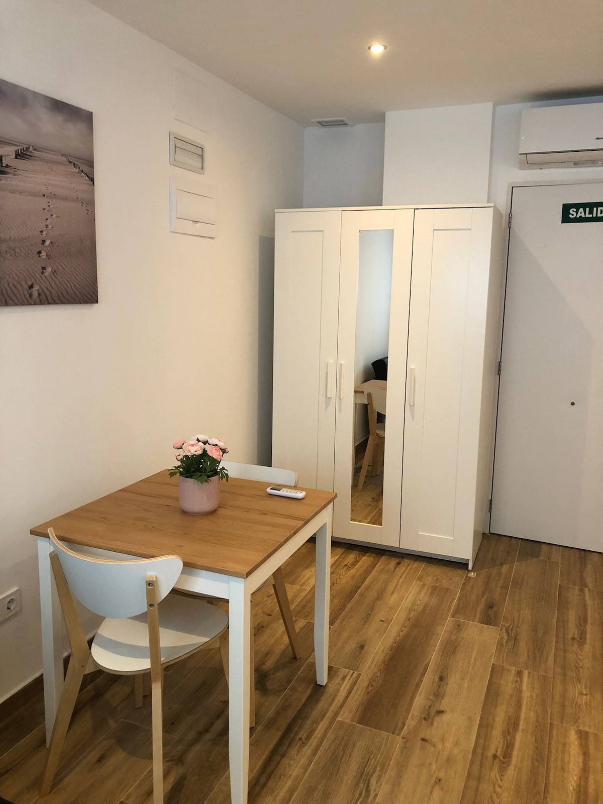 Acogedor estudio ubicado en la planta baja de un bloque de pisos y tiene entrada independiente directamente a la calle en una zona tranquila de Valencia. Reforma de 2024, mucha luz natural y diseño moderno. Equipado con todo lo necesario para una estancia cómoda. A 5 min andando de metro, autobuses y del distrito empresarial con exposiciones, cafés y restaurantes. Ideal para una persona o pareja.
