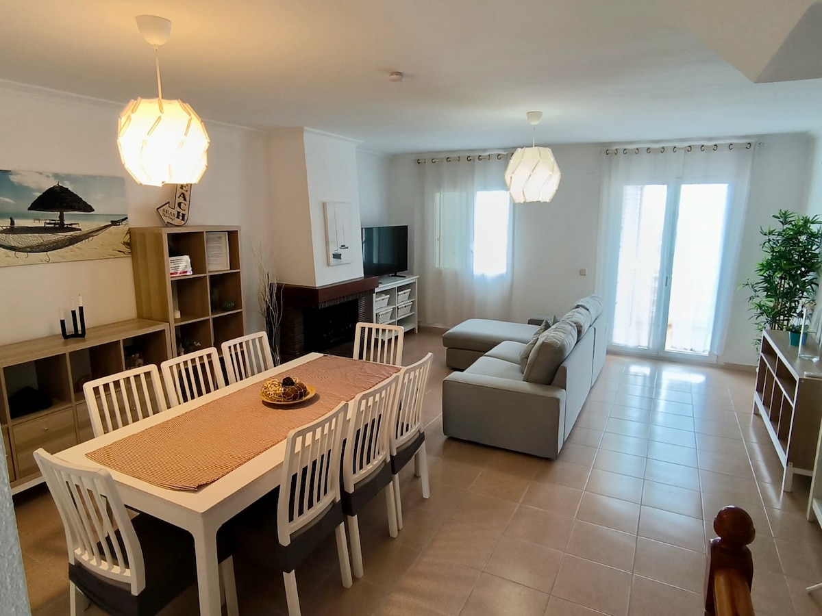 Queremos que nuestros huéspedes se sientan seguros! Limpiamos y desinfectamos después de cada alquiler. Casa de 3 plantas con garaje. Salón comedor con puerta de cristal con vista al mar. Acceso directo a la playa desde la terraza. Chimenea. Cocina reformada y bien equipada, 3 habitaciones dobles y un ático con cama doble. Todos los colchones son nuevos. 2 baño y 1 aseo. Piscina comunitaria con zona para niños. Tabla de SUP a disposición de nuestros huéspedes.